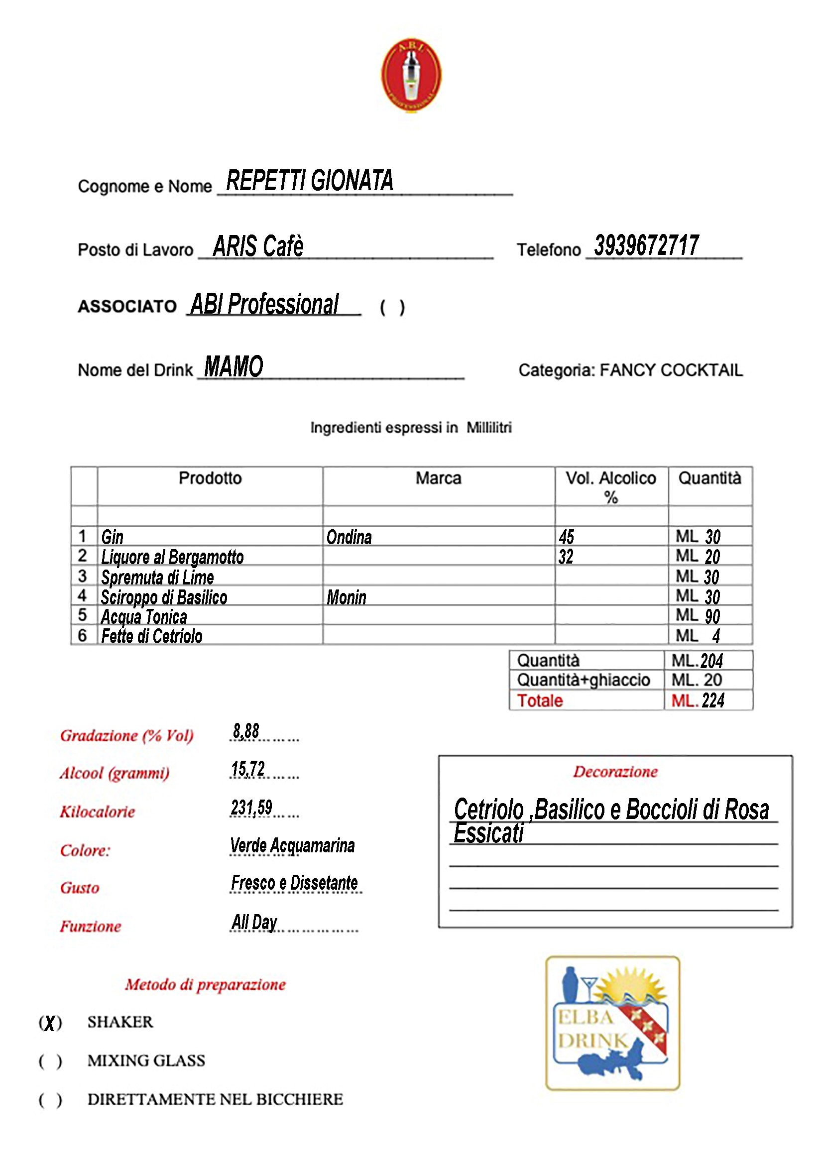 Secondo Classificato Marina Milan scheda-ricetta-elba-drink 2021